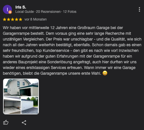 Du kannst uns täglich von Montag bis Freitags telefonisch erreichen unter der 0800 999 7 222 oder per Mail an service@garagenrampe.de schreiben.