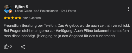 Du bekommst alle relevanten Unterlagen, also Auftragsbestätigung, Rechnung, Bauskizze sowie Fundamentpläne.
