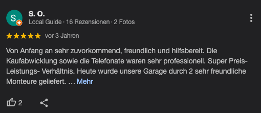 Unter der 0800 999 7 222 kannst du uns Montags bis Freitags anrufen und all deine Fragen stellen. Wir beraten dich gerne und können dir auf Anfrage auch ein Angebot erstellen, falls du hier nicht deine ideale Garage findest.